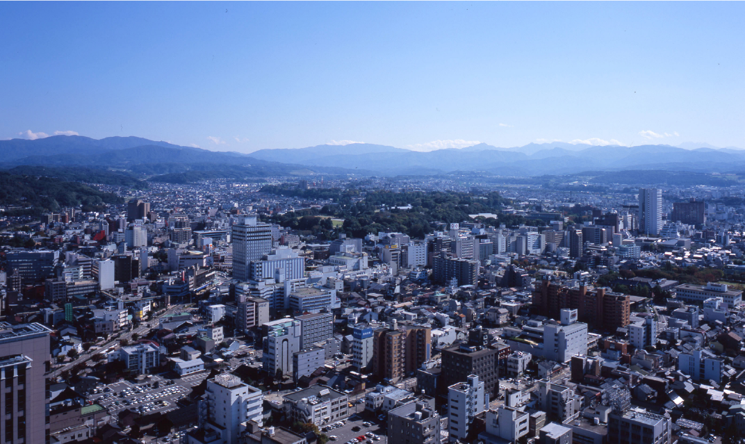 金沢の街並みと、その奥に連なる山々を望む山側の眺め。