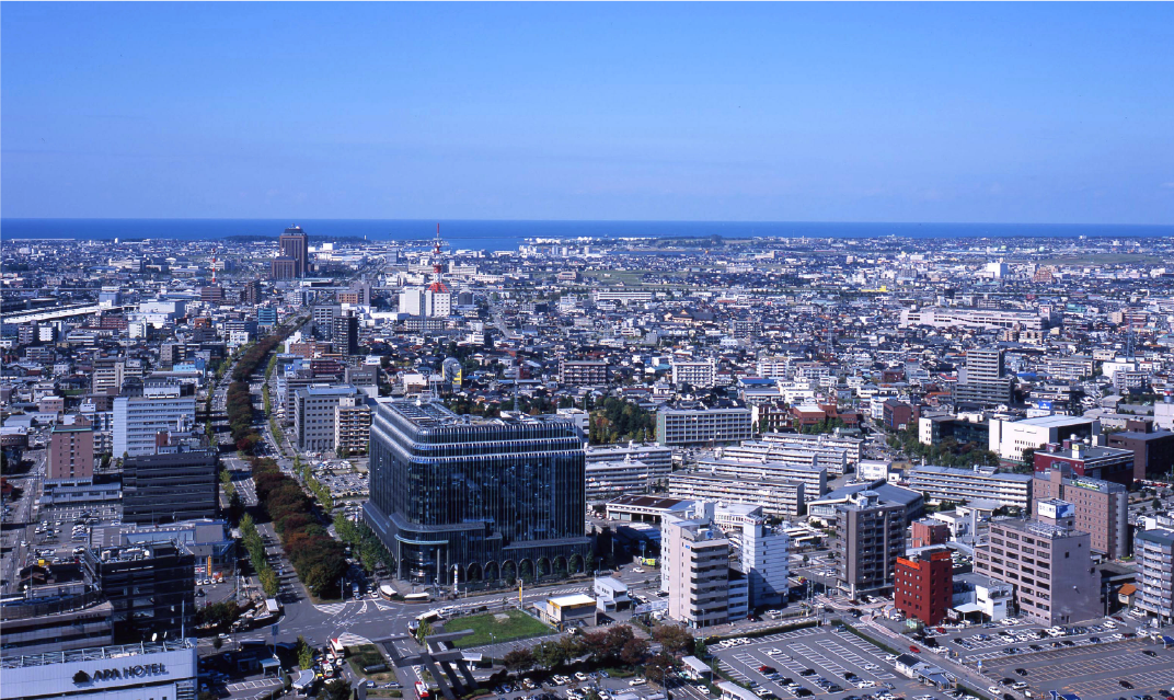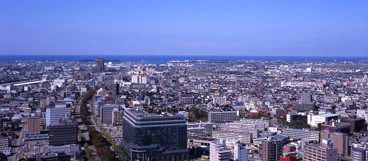 市街地の向こうに日本海を望む海側の眺め。