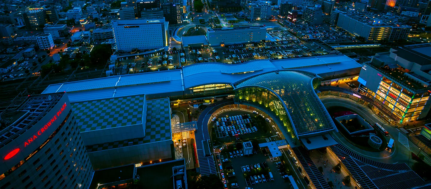 お昼は空と街がひとつながりに見え、夕方から夜にかけては金沢駅や鼓門周辺の灯りがやさしく広がります。